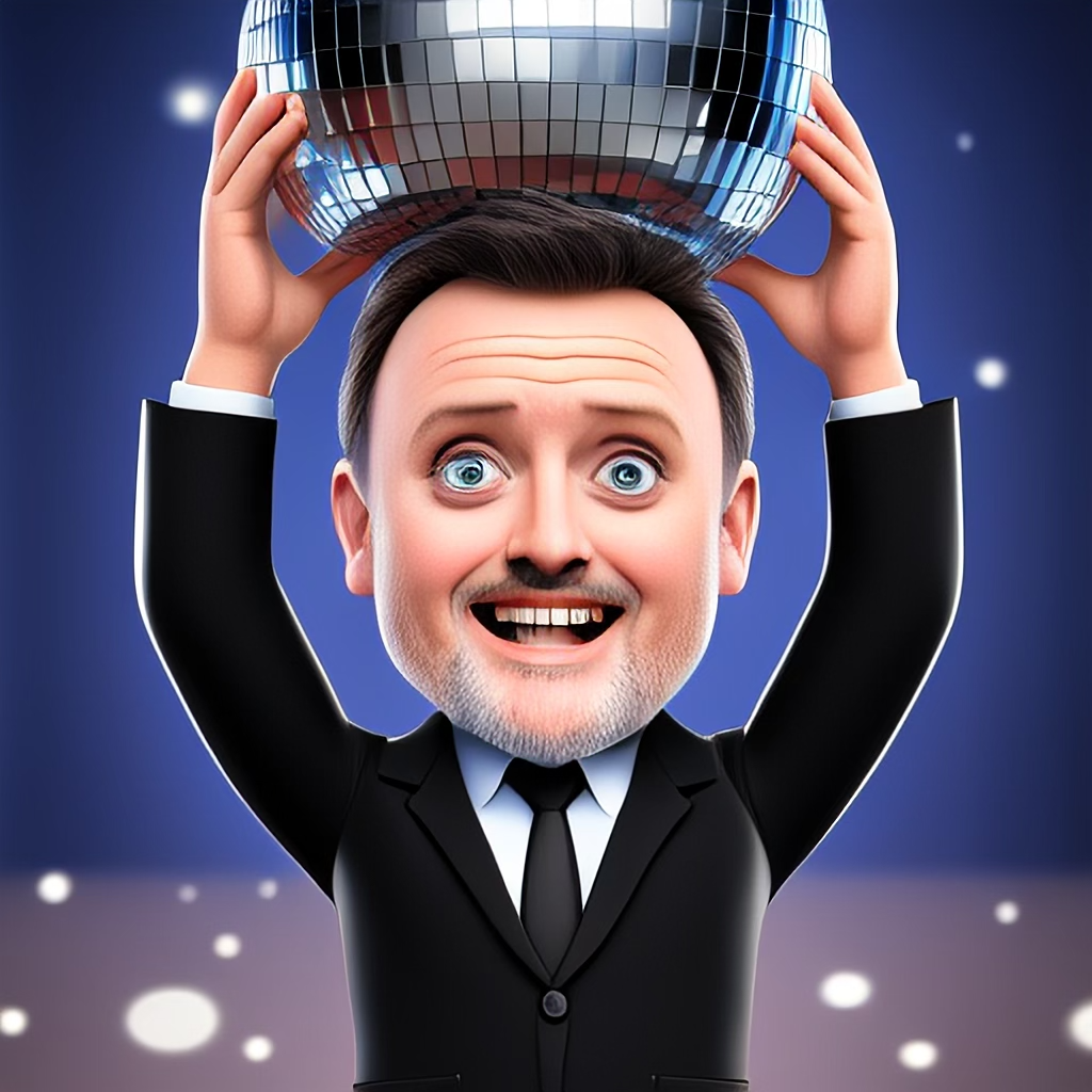Image Description: An AI-generated image of Chris McCausland holding a glitter ball above his head, while wearing a black suit and white shirt.